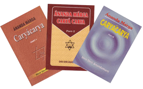 Covers of Ananda Marga Caryacarya Parts 1, 2, and 3.