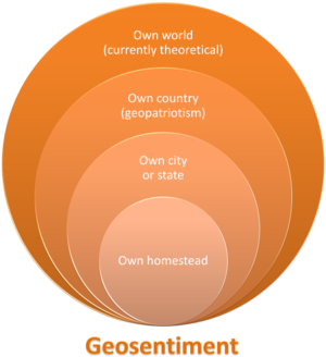 Geosentiment is the attraction felt toward one's own home, city, or country. Its minimal expression (geosentiment minimitis) is love for one's home (house, homestead, or the like). The maximal expression of geosentiment (geosentiment maximitis) is love for one's country. In theory, one might feel love for the entire planet, but today such an expression of geosentiment would be very rare, possibly non-existent. In future, when interplanetary travel becomes commonplace, geosentiment maximitis may expand.