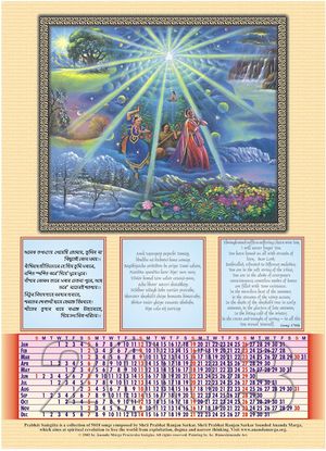 His idea was to bring out a calendar with only one illustration for the whole year – an illustration of the six seasons that would include other imagery of the song – all in a circular form like the cover illustration he had seen. Each year such a calendar would depict a different Prabhat Samgiita song. He thought of the sale of the calendar as a source of income for the monks and nuns of Delhi Sector. And above all, he thought of the calendar as a source of inspiration for all those who would see it. He hoped that the world could come to appreciate the beauty of Prabhat Samgiita, and become spiritually elevated thereby. He hoped that the calendar would hang in the lobby of the United Nations building in New York.