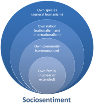 Sociosentiment is the attraction felt toward one's own family, nation, or other social grouping (linguistic, religious, political, and so on). Its minimal expression (sociosentiment minimitis) is the attraction felt toward one's nuclear family. That minimal sociosentiment may be extended to embrace a larger community, for example, a city, a state, a nation, an ethnicity, a religious group, and so on. When sociosentiment extends beyond nationalism and internationalism, theoretically embracing all human beings, that is sociosentiment maximitis. According to Sarkar, general (or ordinary) humanism is essentially sociosentiment maximitis.[14]